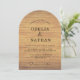 rustic wedding invitation features a trendy arch-shaped design with a warm, natural wood grain background. It perfectly combines elegant serif typography with a cozy, country-chic aesthetic for a modern outdoor wedding.