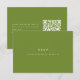 Modern Minimalistic Olive Green Wedding QR Code RSVP Card. A modern and elegant wedding RSVP card, designed in dark olive green and white. Customize with your response deadline on the front, personalize wording and wedding website on the back, and your website again in the QR code.
