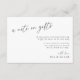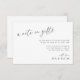 Det här moderna "A Note on Gifts"-kortet är ett tänkbart sätt att begära ett penningbidrag till din smekmånadsfond tillsammans med din bröllopsinbjudan. Den minimalistiska utformningen har en artig dikt som ber om ekonomiskt stöd i stället för traditionella gåvor och skapar det lätt för gästerna att bidra. Du kan anpassa meddelandet så att det stämmer överens med din ton och stil.