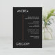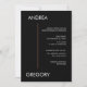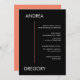 Modern och minimalisten beskriver den här inbjudan till bröllopet för öga. Fet namn i vitt accentuerat med en tunn, lodrät, koral orange och ett enkelt sans serif-teckensnitt på en svart bakgrund gör dina bröllopsinbjudningar till ett typiskt exempel. Detta är perfekten för ett enkelt, elegant bröllop i staden eller ett modernt, inget kulligt bröllop.