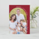 Det här julkortet presenterar en modern minimalistisk design med ett bohemiskt välvt foto. Designen innehåller en krökt rad med vit text som graciöst följer bildens kant. För att tillföra en touch av elegans är designen prydd med vacker handskriven text. Denna kombination av en snygg layout och delikat typsnitt skapar en sofistikerad och stilren julhälsning med en traditionell mörkröd bakgrund och vit text.