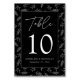 Kort för bordsnummer i elegant bröllop som visar ord "Bord" i ett vitt handskript med bordsnumret, namn och bröllop som visas nedan. Bakgrunden är en svartvit löv mönster. Utformningen upprepas på baksidan. Om du vill beställa bordsnumret skriver du bara varje nummer och lägger till det i kundvagnen.