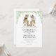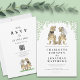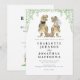 Överraska dina gäster med denna lekfulla och unika dinosaurie-inspirerade bröllopsinbjudan! Med en rolig T-Rex-brud och -brudgum är denna roliga design säker på att ge alla ett leende. De charmiga illustrationerna av dino-bruden och -brudgummen, skapade i varma bruna toner, står mot en bakgrund av frodig eukalyptusflora i levande gröna färger, vilket skapar en fantasifull och inbjudande känsla.