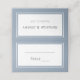 Den här enkla, minimalistiska formgivningen har texten i grått-färgplattan och kursiv text på en vit rektangel, med en tunn vit linje på en dammig blå bakgrund, med blanksteg för att skriva namn på gästerna i bröllop och deras bordsnummer. Insidan av kortet är massivt dammigt blått.