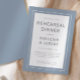 Den här enkla, minimalistiska inbjudan till repetitionsmiddagen innehåller texten i grått-färgplattan och kursiv text på en vit rektangel, som ramas av en tunn vit linje på en dammig blå bakgrund. Baksidan är massiv dammig blå.