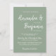 Elegant trendig typography script snyggt avslappnad bröllopsinbjudan i enkel sage grönt och vit handskrift med stor bruds och grooms kalligrafi i namn. +++++++++++++++++++++ Du kan ändra färg på text och bakgrund efter att du har markerat alternativet EDIT USING DESIGN VERKTYG under PERSONALISERA DENNA MALL-meny. ++++++++++ Inbjudan är lämplig för alla säsonger - vår, sommar, höstfall, vinter - ceremoni och mottagning i bröllop.