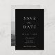 Det här bröllop spara datum-kortet har ett minimalistiskt och modernt stil. Framsidan har en ren vit bakgrund med klassisk svart typografi, där fet typsnitt kombineras med ett skript för ett förfinat utseende. Baksidan visar ett svartvitt foto av paret med textövertäckning som skapar en romantisk och tidlös design.