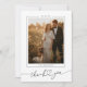 Ett elegant, modernt och minimalistiskt bröllop-tack som du kan visa på när ditt foto är designens högdager. Ett handskrivet stil-kalligrafteckensnitt med eleganten "Tack" som är kopplat till ett hjärta tillför en aning trendig elegans. Anpassa mallen med ditt bröllop-datum, namn i familjen och lodräts foto på framsidan. Ta med ett liggande foto på baksidan och anpassningsbarnas meddelande och namnteckning linje. Visas i ett klassiskt svartvit färg-schema. © Kimbelled, LLC