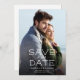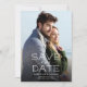 Det här spara datum meddelande-kortet har ett lodrät som fyller på kortets framsida. Texten visas i vitt ovanpå fotot. På baksidan finns anpassningsbar för mer information om bröllop.