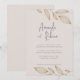 Gratulera till kärlek med den här moderna minimalistiska bröllopsinbjudan under löv. Med elegant konsthölje i guld på en mjuk rosa ger den här designen dig ny, naturlig estetisk till din speciella dag. Kombinationen handskript och tidlös serif typsnitt skapar en harmonisk blandning av värme och sofistikering - perfekt för trädgårdsbröllop, utomhusceremonier eller moderna romantiska teman. Anpassa namn, data och plats utan problem.