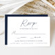 Enkelt, elegant bröllop OSA kort med ett handskript som är skrivet i marinen och blandat med modern text mot en vit bakgrund. Anpassa de minimalistiska bröllopen OSA med önskat svarsdatum, anpassningsbarna accepterar/avböjer formuleringar och måltider. Det chic marinkortet är perfektens val för det moderna bröllop.