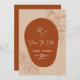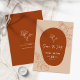 Modern boho terracotta brände orange bröllop spara datum kort. Minimalistisk utformning av elegant i artetiska toner av koppar. Med trendiget kan du skapa botaniska accenter och snyggtens handskrivna skriptteckensnitt. Du kan välja utskrivna kort och/eller en digital mall för omedelbar nedladdning.