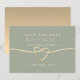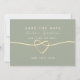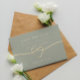 Modern, elegant, minimalistisk sälggrön bröllopsinbjudan med enkel handskriven skrift och guldband hjärta.