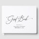 Den här bröllop-gästboken erbjuder en modern minimidesign med elegant-skripttext. Den svarta texten visas på en ren vit bakgrund.