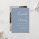 Den här enkla moderna bröllopsinbjudan innehåller vit text på en dammig blå bakgrund. Lägg till bildens och bildens namn i snyggtens handskriftsgrafi och detaljerna i sans serif-teckensnitt. Byt enkelt ut exempelbilden på baksidan mot ett eget foto.