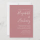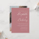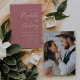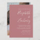 Den här enkla, moderna bröllopsinbjudan innehåller vit text på en dammig ro bakgrund. Lägg till bildens och bildens namn i snyggtens handskriftsgrafi och detaljerna i sans serif-teckensnitt. Byt enkelt ut exempelbilden på baksidan mot ett eget foto.