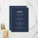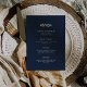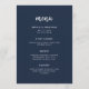 Den här eleganten har ett minimalistiskt bröllop-menykort modern skripttypografi och ren, sans serif-text för en enkel mörk med snyggt marin blå design som du kommer att använda i kärlek.