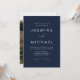 Enkelt, inbjudningar från elegant bröllop som innehåller ett vitt, handskrivet skript blandat med modernt brev mot en marin bakgrund. Anpassa den minimalistiska bröllopsinbjudan med ditt namn och uppgifter om bröllop. Inbjudan återgår till visningen av förlovningen för fullt-utfall i lodrät. Chicens bröllopsinbjudningar till marinen är perfektens val för det moderna bröllop.