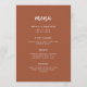 Den här eleganten har ett minimalistiskt bröllop-menykort modern skripttypografi och ren, sans serif-text för en enkel och boho terracotta och vit design som du kommer att kärlek.