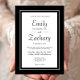 Den här enkla, klassiska, minimalistiska designen har den första namnen av bruden och trippen i det moderna visningen och den återstående texten i svart på en vit rektangel som ramas av en svart dubbla gräns. Baksidan är helsvart.