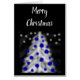 God jul hälsningskort med svart bakgrund på fram- och elegant-vit Julgran med blå dekorationer och stjärnor på grått-bakgrunden på framsidan med "Wishing You A God jul" och du kan anpassa frasen Bakåt på kortet med svart bakgrund och "Santa's Watching" och du kan också anpassa dig till kostym i önskemål