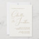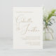 Ett modernt, minimalistiskt bröllop bjuder ut en rik krämkort på framsidan med guld handskriven manustypografi. Anpassa alla viktiga detaljer, t.ex. brid och groom namn, datum och plats för bröllop. Den motsatta sidan samordnas i en grönt som framträder i mörken.