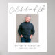Denna moderna minnestavla har en klassisk vit bakgrund, ett vertikalt foto och en enkel men elegant typografi. Den text som står på framsidan säger "Firande av livet". Denna design koordinerar med andra minnesföremål i vår butik, såsom tackkort och minneskort.