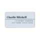 Returetiketter med ljusdammig blått eller anpassningsbar färg med ditt namn justerat till lämnat och returadress justerat till högerna åtskilt med en tunn linje. Typsnitt och färg kan anpassas med verktyg.