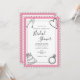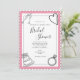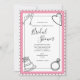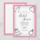 Roligt modern svartvit design inbjudningskort för möhippan med hand plockade bröllop-grafik i varje hörn. Rosa accent färg. Helt inramad med en vit skalad kant med svart kontur. Samordningen av typsnitt bidrar till att göra denna utformning ännu mer vacker.
