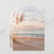 Ett sofistikerat och modernt inbjudningskort för möhippan som visar upp en fredlig strandscen, där känsliga pampasgrässor ligger i den varma glöden av en solnedgång och skapar en serenambians och elegantens ambians.