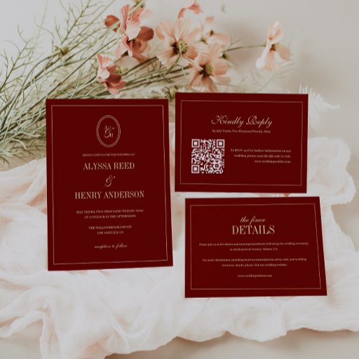 Modern Monogram Classic Wine Red Wedding Inbjudningar