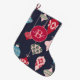 Den moderna och snyggt personligens julstrumpor med farliga träd-prydnadsföremål mönster på marinblå bakgrund.