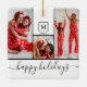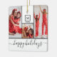 Dekorera träd med den här moderna monogramfärgade fotoornamenten. Den här designen har tre kortplatser för foton och glad helg i ett handskript.