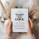 En snygg och minimalistisk Save the Date med en djärv svart monogram och den uppriktiga frasen “Inget Tjafs, Bara Kärlek.”