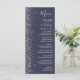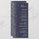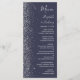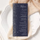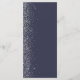 Den moderna bröllop-menyn på den lämnat kant i eleganten har en silver faux glitter-design. Med anpassadet kombineras handskrift, tryckplåt och kursivt typsnitt med silver grått på mörkens blå bakgrund. Den omvända sidan har en passande mörk blått utformning och silver glitter.