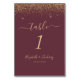 Det moderna bröllop-bordsnumret kant i denna elegant har en guld faux glitter-utformning. Anpassadet kombinerar handskrift, rityta och kursivt typsnitt i blek guld-färgad på en mörks burgundbakgrund.