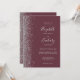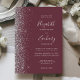 Den här elegantens lämnat kant har en modern bröllopsinbjudan i silver i glitter. Anpassadet kombinerar handskrift, tryckplåt och kursivt typsnitt på en mörk-burgundbakgrund. Den bakomliggande sidan har en matchande burgundi- och silver glitter-design.