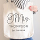 Meddela den nya "Mrs." med denna moderna tote som har en stor kalligrafiskrift i kombination med ett personligt efternamn och fastställt datum i ren samtida stil. En chic monogrampresent perfekt för smekmånad, bröllopsdag eller som bröllopsgåva. Efternamn och datum kan anpassas helt efter önskemål.
