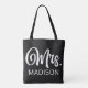 Den dubbelsidiga utformningen av personligen bröllop till väskan visar ett slående monogram med contemporary i ett modernt vitt teckensnitt mot en svart bakgrund. Monogrammet visningar elegant det gifta efternamnet på bruden, skrivet i ett djärvt och modernt Fru script.