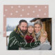 Modern helgdag-fotokort med "God jul" som visas i ett vitt handskrivet skript som täcker vågräts foto. Anpassa framsidan av julfotokortet med din familj namn och året. Kortet återgår till dammig ro och vit snöflinga mönster.