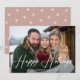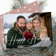 Modern helgdag-fotokort med "Glad helg" som visas i ett vitt handskrivet skript som täcker vågräts foto. Anpassa framsidan av fotokortet till din familj namn och året om. Kortet återgår till dammig ro och vit snöflinga mönster.