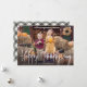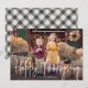 Cute Thanksgiving-fotokort med "Happy thanksgiving" som visas i ett vitt handskrivet skriptöverlägg. Anpassa kortet med ditt favoritfoto för vågrät och din familj namn med vita bokstäver. Kortet återgår till visningen med en svart och gräddvit bakgrundsfärg.