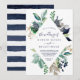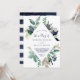 Denna moderna nautiska grönska diamant geometriska bröllopsinbjudan är perfekt för ett kryssnings- eller strandbröllop. Den botaniska designen har vackra gröna blad med marinblå blommor och guldstjärna accenter, vilket ger den en strandig känsla.