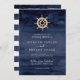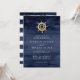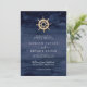 Den här moderna marinens frakt-helginbjudan är perfekt för ett kryssnings- eller strandbröllop. Den enkla utformningen har ett guld-båthjul på en marin blå vattenfärgsbakgrund.