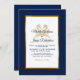 Inbjudan dina gäster för att hjälpa dig att fira din speciella dag med den här inbjudan till elegant som innehåller ett modernt skript, marinblått och guld, inklusive konstnärliga sjömakar och en metallisk folie ram på framsidan av kortet. En marin blå bakgrund är på framsidan och baksidan.