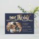 Modern marin blå bild och guld bröllop sparar datumkorten med ett typsnitt för eleganten. Anpassa enkelt det här fotokortet med information om bilder och bröllop.