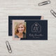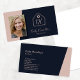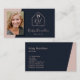 Elegant och professionell i affärskortet gods agent med ett foto. Modern logotyp på framsidan med skriptteckensnitt i rosa och bakgrund i marinblått färg.