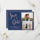 Elegantens moderna marinkort med handskriven kalligrafi i ro guld två fotokort från spara datum meddelande. Minimalistisk bröllop-design har ett elegant stort kursivt kalligrafiskript för rosa ros guld med texten "Spara datum" och två foto med ram på mörkens blå bakgrund färg. Mellan namn är en söt liten hjärtform. Kontakta mig om du behöver hjälp eller matchande artiklar.