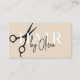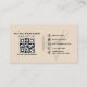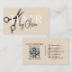 Ett affärskort med neutralt i chic med ett modernt saxeraccent, fet typografi och skannerbar QR-kod för omedelbar bokning eller social-media. Designad för hårstilister och skönhetsiga professioneller som vill ha en ren, tidlös och professionell som ser ut med en subtil lyxkänsla.