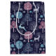 A modern abstract pattern with white deer leaping and prancing against a night blue background filled with turquoise blue and purple trees.